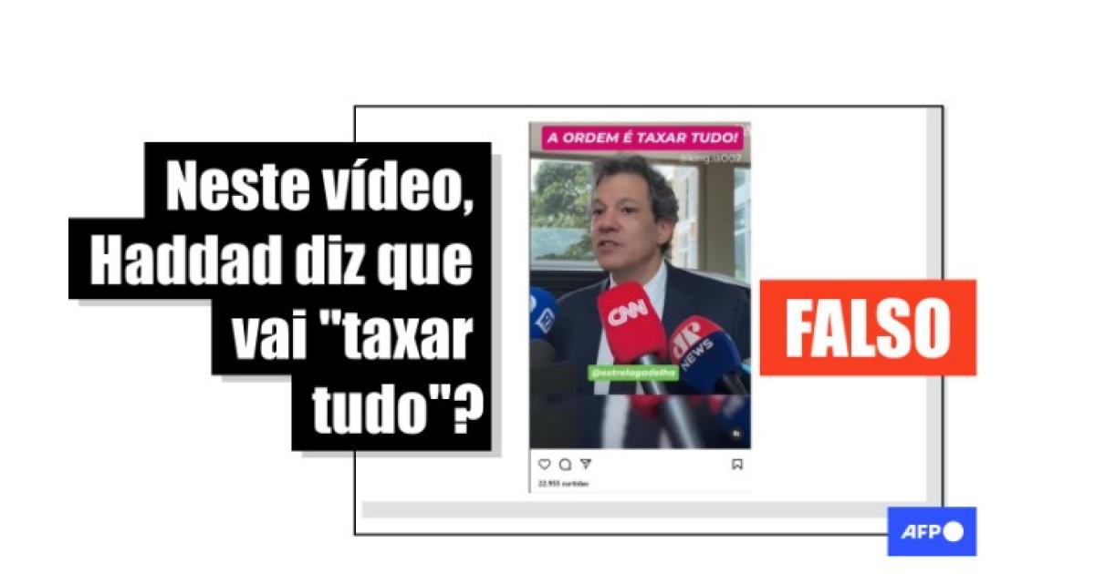 “A ordem é taxar tudo!”, lê-se no texto sobreposto a um vídeo publicado no Instagram. “Nosso plano é taxar tudo, tudo. Esse ano teremos imposto do cachorrinho de estimação. Se ele é da família, temos que arrecadar sobre ele também. Imposto pré-natal: ficou grávida já tem que começar a pagar imposto para o hospital. Imposto das Bets: se perder, o prejuízo é seu; se ganhar, o lucro é nosso”, diz supostamente o ministro Fernando Haddad.
