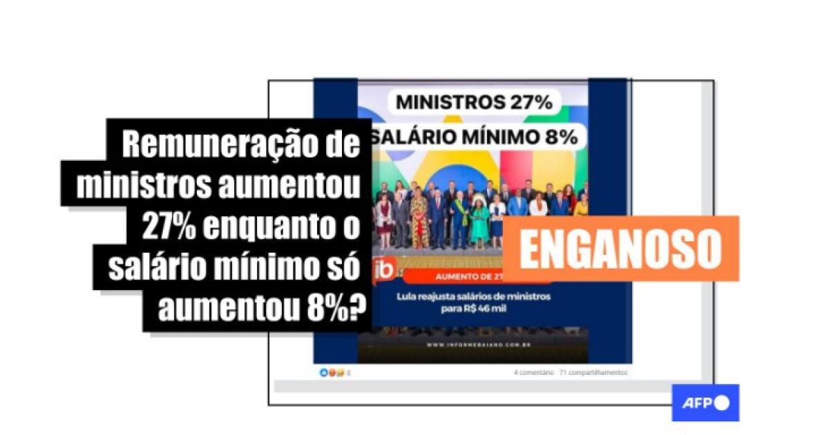 “Ministros 27% Salário Mínimo 8% Aumento de 27% Lula reajusta salários de ministros para R$ 46 mil”, diz uma imagem que circula no Facebook, no Instagram, no Threads e no Kwai.