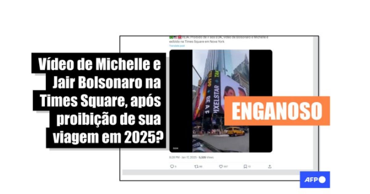 “Proibido de ir aos EUA, vídeo de Bolsonaro e Michelle é exibido na Times Square em Nova York”, diz a legenda de publicações que circulam com o vídeo no Instagram, no Facebook, no X, no Telegram, no TikTok e no YouTube.