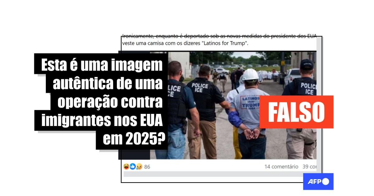 “Ironicamente, enquanto é deportado sob as novas medidas do presidente dos EUA, o brasileiro veste uma camisa com os dizeres ‘Latinos for Trump’”, diz a legenda de uma publicação com a imagem no Facebook, que mostra agentes do Serviço de Controle de Imigração e Alfândega dos Estados Unidos (ICE, na sigla em inglês) escoltando um homem que veste uma camiseta cinza com a frase “Latinos for Trump 2024”. Alegação similar circula no Instagram e no X.
