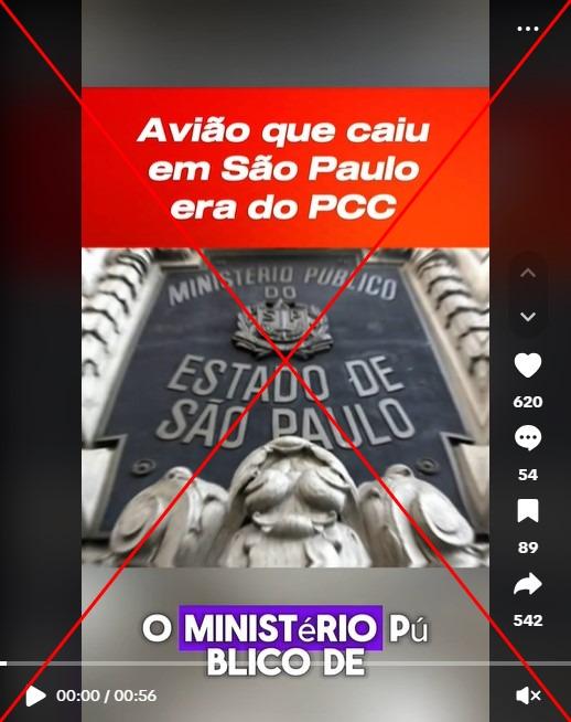 Em 7 de fevereiro de 2025, um avião caiu em uma avenida de São Paulo, deixando dois mortos. A partir de então, um vídeo com milhares de compartilhamentos nas redes sociais alega que o Ministério Público do Estado descobriu que a aeronave teria relação com a facção criminosa Primeiro Comando da Capital (PCC). Entretanto, o organismo negou que tenha conhecimento das afirmações feitas na gravação. Além disso, as imagens usadas na sequência viral foram retiradas de casos que não se relacionam com a queda da aeronave na capital paulista.