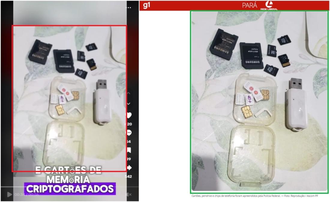 Já a foto dos cartões de memória e chips foi encontrada em outra matéria do g1, de julho de 2022, que reporta uma operação da Polícia Federal contra pornografia infantil em Belém.
