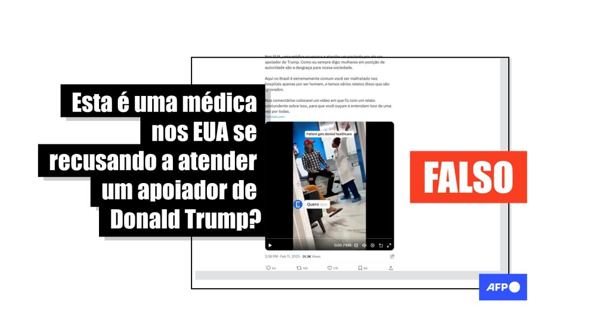 “Nos EUA, uma médica se recusa a atender um paciente por ele ser apoiador do Trump”, diz uma mensagem publicada junto ao vídeo viral no X. O conteúdo também circula no Facebook e no Instagram.