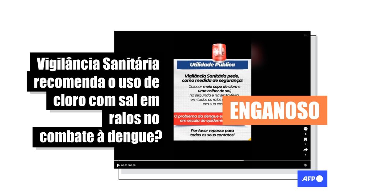 Embora as peças de desinformação não especifiquem de qual cidade seria a recomendação da vigilância sanitária, a Agência Nacional de Vigilância Sanitária (Anvisa) confirmou, em e-mail ao Checamos, que “não orienta o uso de ‘cloro’ e ‘sal’ para combate da dengue”.