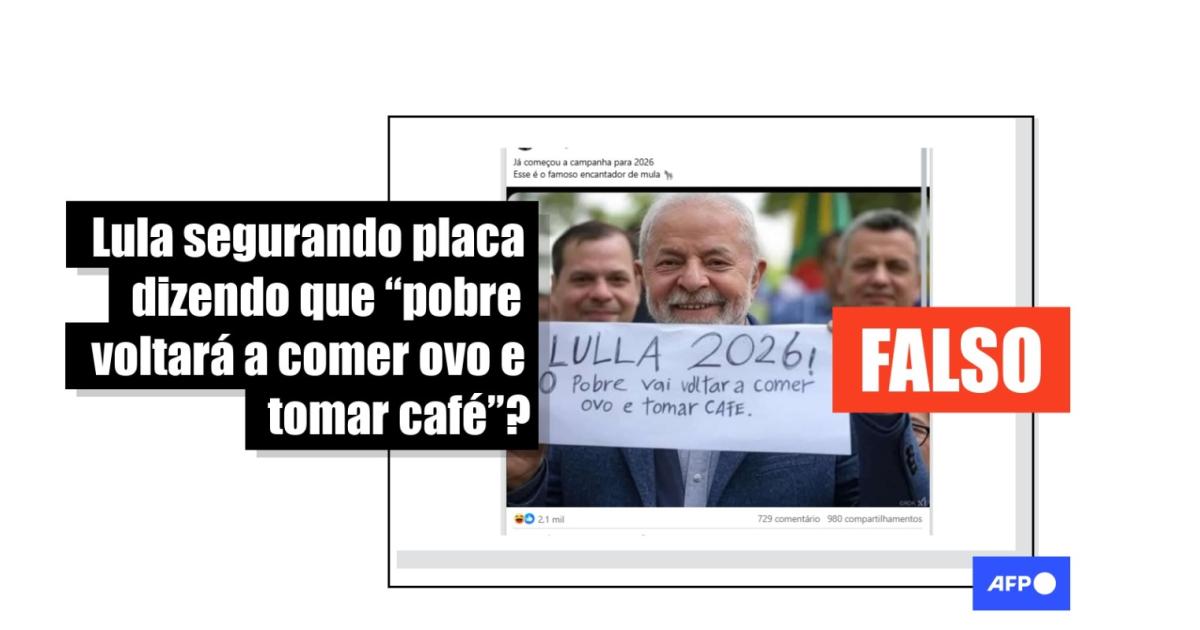 “LULLA 2026! O Pobre vai voltar a comer ovo e tomar CAFE”, lê-se na imagem que circula no Facebook e no Instagram, em que Lula supostamente segura um cartaz com essa inscrição.