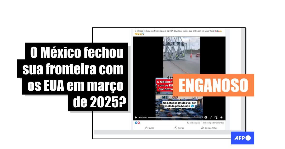 “O México fechou sua fronteira com os EUA devido às tarifas que entraram em vigor hoje. Os Estados Unidos vai ser isolado pelo mundo”, diz a mensagem que acompanha as publicações no Facebook, no Instagram, no TikTok, no Kwai e no YouTube.