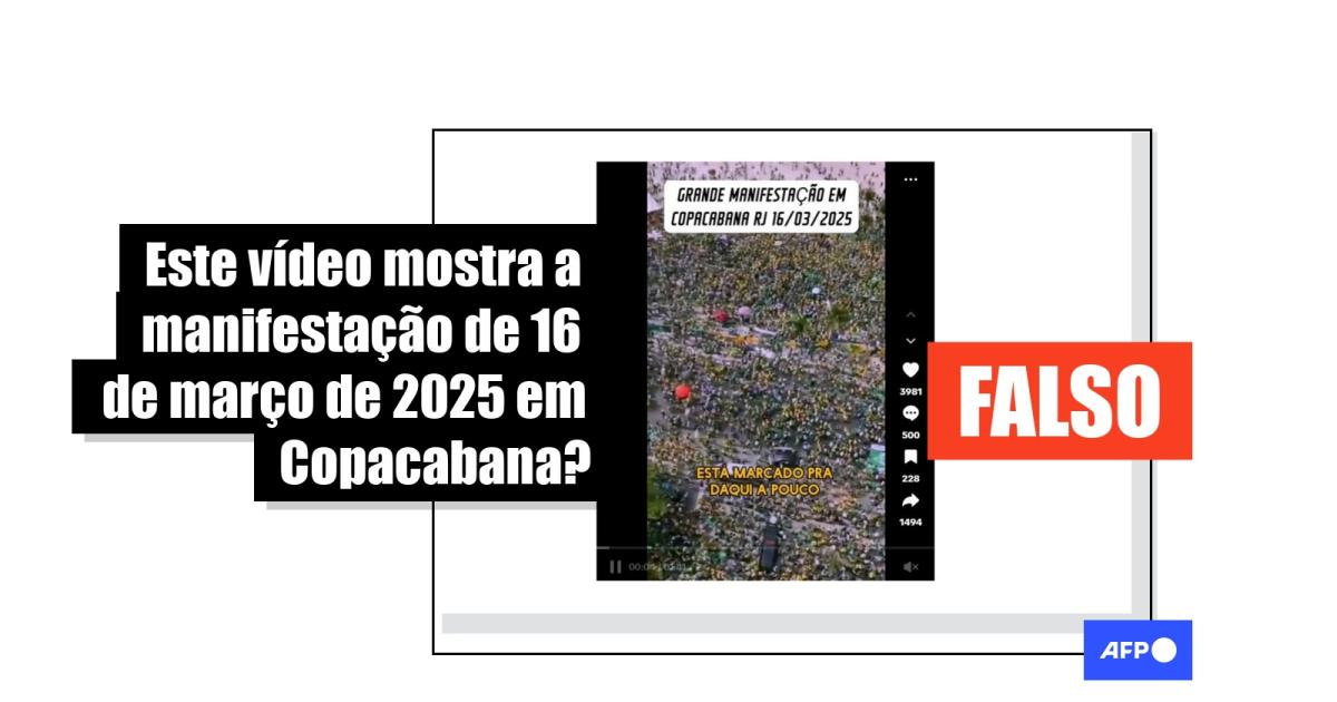“Grande manifestação em Copacabana RJ 16/03/2025”, lê-se no texto sobreposto a um vídeo que circula no TikTok, no Facebook, no Kwai e no Instagram.
