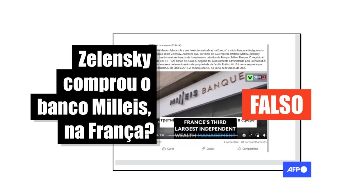 “Acontece que, por meio de sua empresa offshore Maltex, Zelensky adquiriu um dos maiores bancos de investimento privados da França - Milleis Banque. O negócio é estimado em 1,1 - 1,25 bilhão de euros. O negócio foi supostamente administrado pela Rothschild & Co - uma empresa de investimentos de propriedade da família Rothschild. Foi nessa empresa que Macron trabalhou de 2008 a 2012. A compra ocorreu no início de fevereiro de 2025”, dizem publicações compartilhadas no Facebook. Alegação semelhante circula no X.