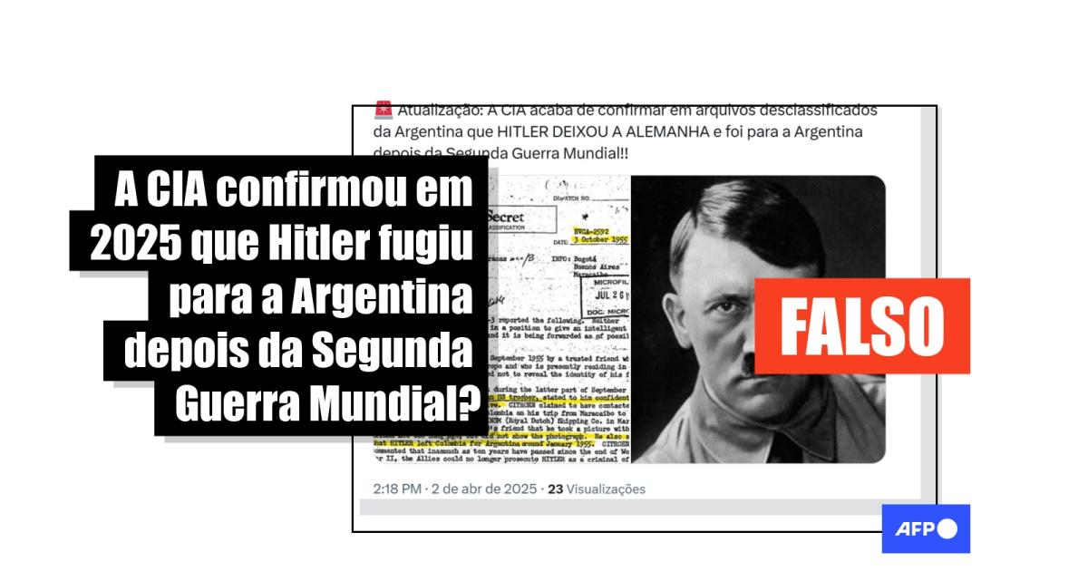 “A CIA acaba de confirmar em arquivos desclassificados da Argentina que HITLER DEIXOU A ALEMANHA e foi para a Argentina depois da Segunda Guerra Mundial!!”, é a legenda de publicações compartilhadas dezenas de vezes no Facebook, no Reddit e no X.