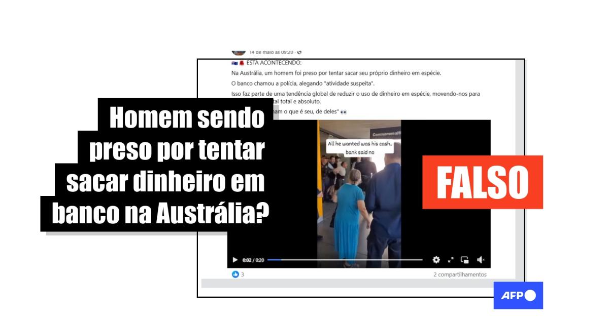 “ESTÁ ACONTECENDO: Na Austrália, um homem foi preso por tentar sacar seu próprio dinheiro em espécie. O banco chamou a polícia, alegando ‘atividade suspeita’. Isso faz parte de uma tendência global de reduzir o uso de dinheiro em espécie, movendo-nos para um controle digital total. ‘Os bancos chamam o que é seu, de deles’”, diz uma das publicações compartilhadas no Facebook, no Instagram, no X e no Telegram.