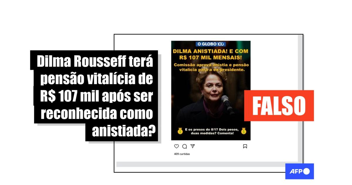 “DILMA ANISTIADA! E COM R$ 107 MIL MENSAIS! Comissão aprova anistia e pensão vitalícia para a ex-presidente”, lê-se no texto sobreposto a uma imagem com o logo do jornal O Globo publicada no Instagram e no Facebook. Conteúdo semelhante também foi compartilhado no Kwai.