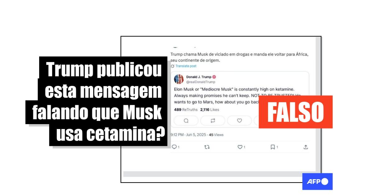 “Trump chama Musk de viciado em drogas e manda ele voltar para África, seu continente de origem”, diz uma das publicações no X. A postagem é acompanhada da imagem de uma suposta publicação de Donald Trump que diz, em inglês: “Elon Musk ou ‘Musk Medíocre’ está constantemente chapado de cetamina. Ele está sempre fazendo promessas que não consegue cumprir. ELE NÃO É CONFIÁVEL. Ele quer ir para Marte, que tal você voltar para a África”.