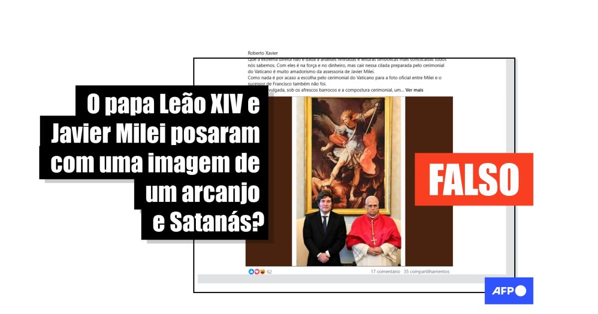 “Na foto divulgada, sob os afrescos barrocos e a compostura cerimonial, um detalhe escapou ao controle de protocolo: a espada flamejante de São Miguel Arcanjo, aquela que pela tradição católica, separa o bem do mal com precisão celeste apontava, com extrema precisão, para a cabeça de Milei”, diz o trecho de uma publicação compartilhada no Facebook e no Instagram.