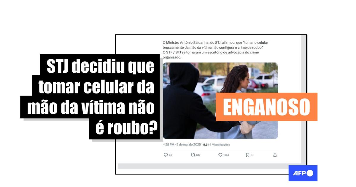 “O Ministro Antônio Saldanha, do STJ, afirmou que ‘tomar o celular bruscamente da mão da vítima não configura o crime de roubo.’ O STF / STJ se tornaram um escritório de advocacia do crime organizado”, diz a legenda de uma publicação no X. Conteúdos semelhantes circulam no Instagram, no Facebook e no Kwai.