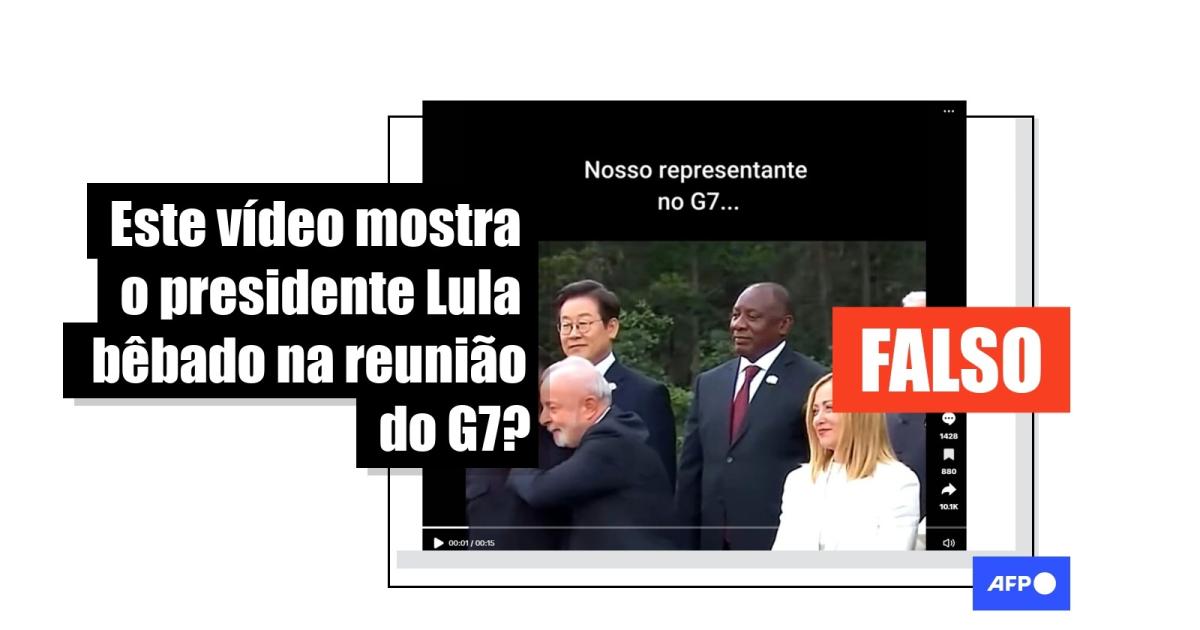 A alegação é compartilhada junto a um vídeo que mostraria o presidente Lula abraçando líderes mundiais e, em seguida, caindo durante a foto oficial da cúpula do G7. A música “Marvada Pinga” toca ao fundo — reforçando a insinuação de que ele estaria embriagado.