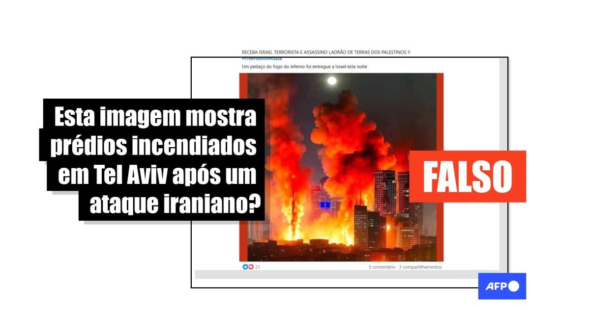 Uma imagem que mostra edifícios em chamas após ataque do Irã a Tel Aviv em 2025 foi editada