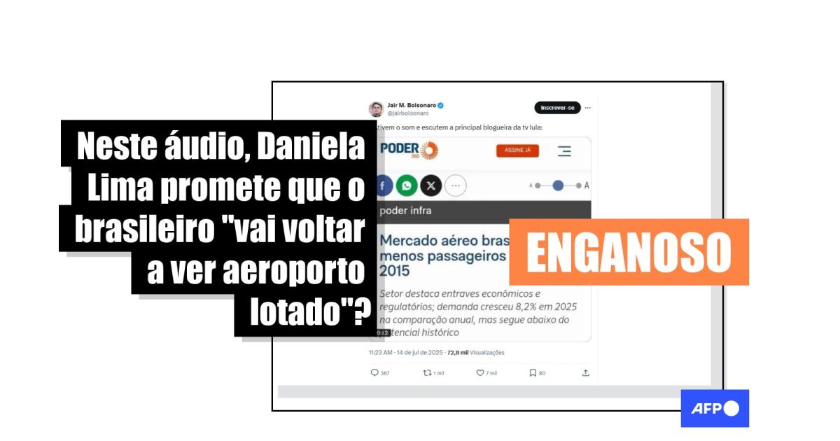 “Ativem o som e escutem a principal blogueira da tv lula”, diz a legenda de uma publicação feita pelo ex-presidente Jair Bolsonaro (PL) em sua conta no X. O vídeo exibe uma captura de tela de uma notícia do portal Poder360 intitulada: “Mercado aéreo brasileiro tem menos passageiros do que em 2015”.