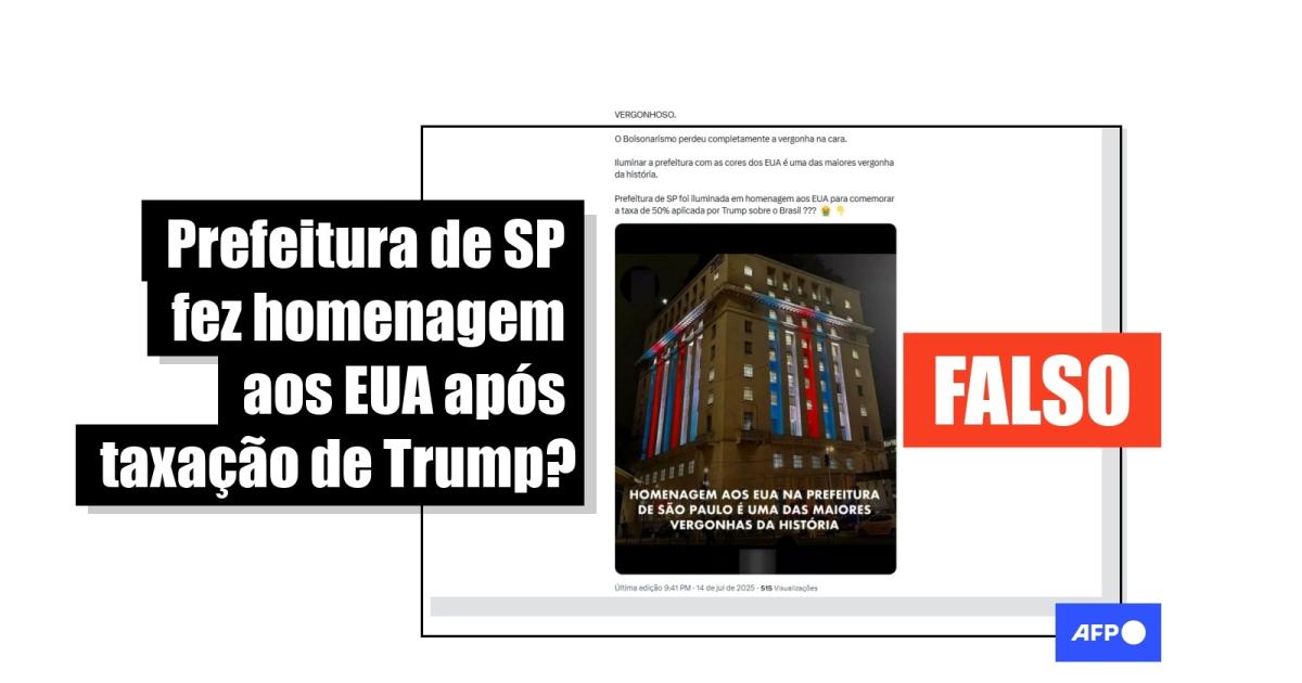 Diante da crise diplomática, usuários associam falsamente a iluminação da sede da prefeitura de São Paulo a um suposto sinal de apoio do prefeito da capital paulista, Ricardo Nunes (MDB), às medidas dos Estados Unidos.
