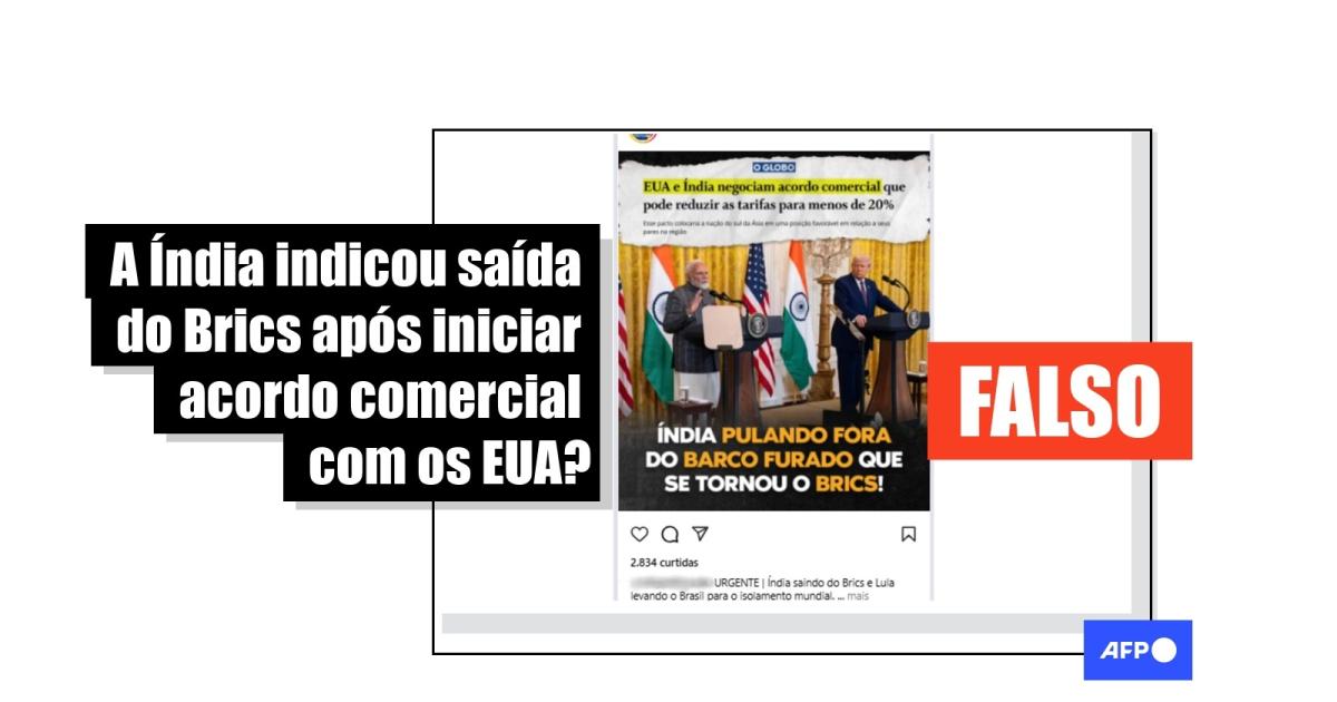 Buscas com as palavras-chave “Índia", "Brics" e "saída", em inglês, tampouco levaram a notícias compatíveis com a alegação viral.