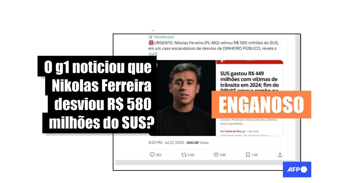 “URGENTE: Nikolas Ferreira (PL-MG) retirou R$ 580 milhões do SUS, em um caso escandaloso de desvios de DINHEIRO PÚBLICO, revela o g1!”, diz uma publicação no X. O conteúdo também circula no Facebook, no Instagram, no TikTok e no Kwai.