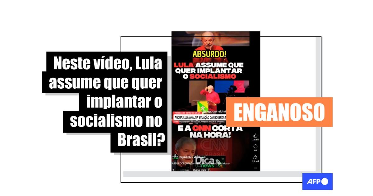 “Lula assume que quer implantar o socialismo e a CNN corta na hora!”, lê-se no texto sobreposto a um vídeo no Facebook. Na gravação, o presidente Lula diz: “É muito pouco para um partido de esquerda. Um partido de esquerda quer que o presidente diga que vai alcançar o socialismo. Sério, é verdade. Eu sei o que as pessoas pensam, mas eu tenho uma coisa que o sindicato (...)”. Em seguida, o discurso é interrompido pela apresentadora da CNN Muriel Porfiro encerrando o jornal Agora CNN.