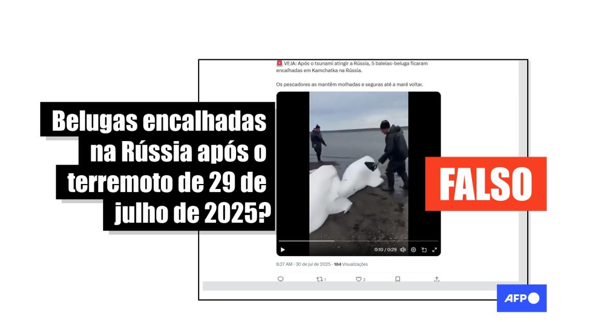 “Baleias-beluga encalharam na costa de Kamchatka, Rússia, poucas horas antes do tsunami provocado por um terremoto de magnitude 8,8. Pescadores locais mantiveram os animais seguros e hidratados até a maré subir, permitindo que retornassem ao mar”, diz uma das publicações compartilhadas no Facebook, no Instagram, no Threads, no X e no Bluesky.