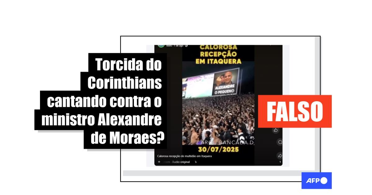 "CALOROSA RECEPÇÃO EM ITAQUERA", lê-se na parte superior do vídeo que circula no Facebook, no qual se vê a torcida do Corinthians supostamente cantando: "Ô ô ô, Alexandre, o pequeno, se esconde na toga, mas está sempre tremendo. Ô ô ô, Alexandre, o pequeno, aqui é o povo e ninguém mais tem medo. Pode ameaçar, tentar silenciar, mas agora é o povo que vai te derrubar".