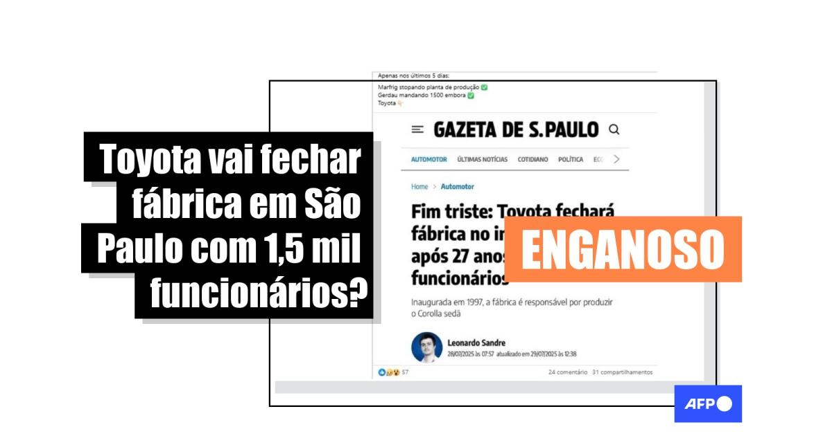 Procurada pelo AFP Checamos, a assessoria de imprensa da Toyota afirmou, em 6 de agosto, que a transferência das operações da unidade de Indaiatuba para Sorocaba foi anunciada em março de 2024 e “foi uma decisão estratégica da companhia com a finalidade de unificar e otimizar sua produção”.