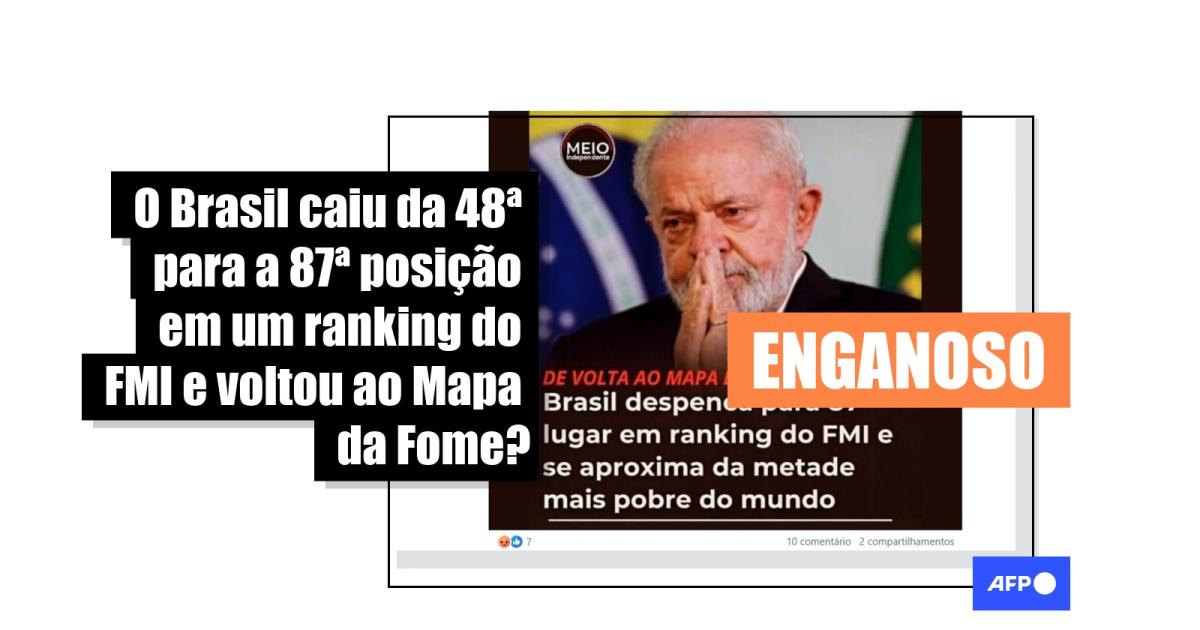 “De volta ao mapa da fome: Brasil despenca para 87º lugar em ranking do FMI e se aproxima da metade mais pobre do mundo”, lê-se abaixo do rosto de Lula em uma imagem que circula no Facebook, no Instagram, no TikTok e no X.
