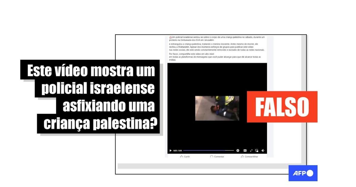 “Um policial israelense sentou-se sobre o corpo de uma criança palestina no sábado, durante um protesto na Embaixada dos EUA em Jerusalém e estrangulou a criança palestina, matando o menino inocente”, diz uma das publicações que acompanham a gravação viral no Facebook, no Instagram e no Threads.