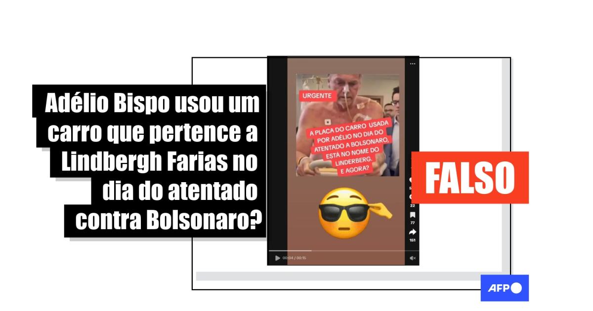 “A PLACA DO CARRO USADA POR ADÉLIO NO DIA DO ATENTADO A BOLSONARO, ESTÁ NO NOME DE LINDERBERG. E AGORA?”, lê-se em uma imagem que circula no Kwai, no Facebook, no Instagram, no TikTok e no X.