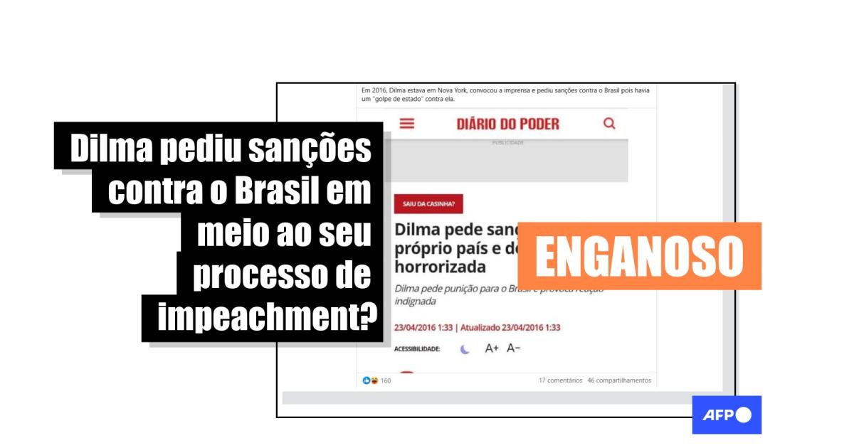 “Em 2016, Dilma estava em Nova York, convocou a imprensa e pediu sanções contra o Brasil pois havia um ‘golpe de estado’ contra ela”, diz uma das publicações que circulam no Facebook. O conteúdo também é compartilhado no X, no TikTok e no Kwai.
