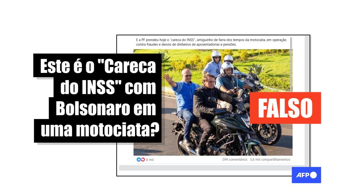 “E a PF prendeu hoje o 'careca do INSS', amiguinho de farra dos tempos da motociata, em operação contra fraudes e desvio de dinheiros de aposentadorias e pensões do INSS”, lê-se na legenda que acompanha uma imagem de Bolsonaro em uma moto com um homem na garupa, no Instagram, no Facebook, no X, no Threads e no TikTok.
