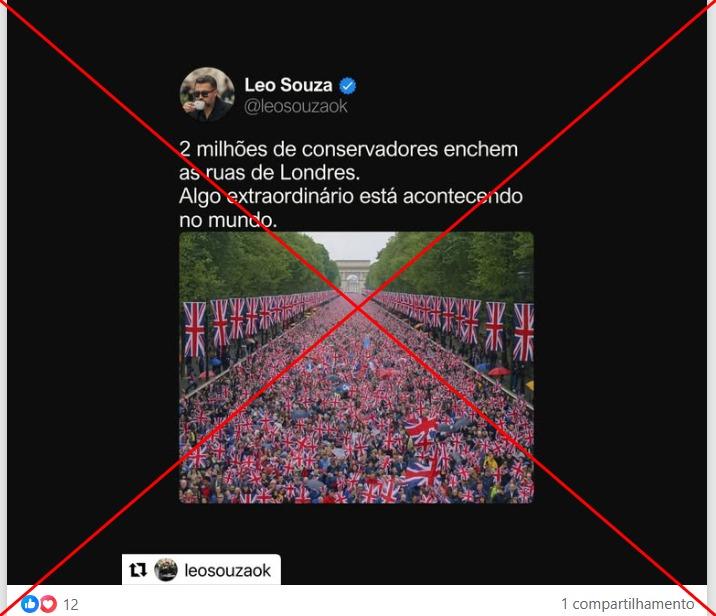 Além disso, embora uma busca reversa pelo registro viral mostre resultados vinculados a fotografias do Jubileu de Platina pelos 70 anos de reinado de Elizabeth II em 2022 (1, 2), o monumento visto ao fundo desses registros, o Arco do Almirantado, também não coincide com a imagem compartilhada nas redes sociais.