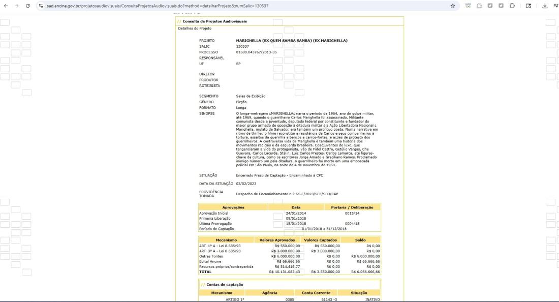 O longa “Marighella” foi autorizado a captar recursos pela lei nº 8.685/1993, conhecida como Lei do Audiovisual, específica para projetos do audiovisual. Dentre os valores que compõem a cifra de R$ 10 milhões há montantes descritos como “recursos próprios”.