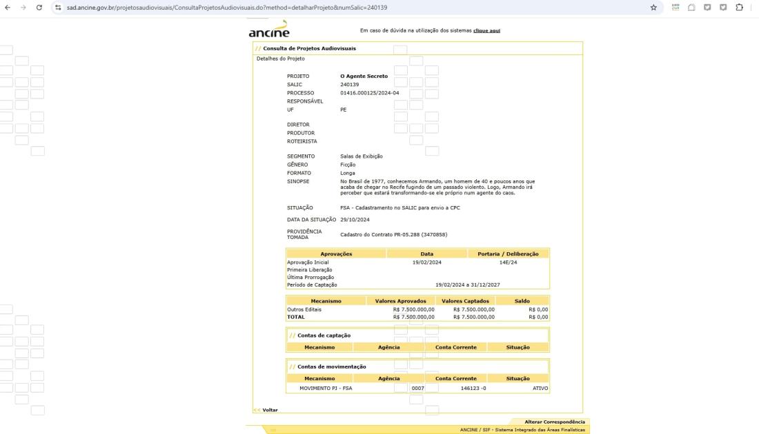 Já o filme “O Agente Secreto” captou financiamento pelo Fundo Setorial do Audiovisual (FSA), um dispositivo da Lei do Audiovisual.