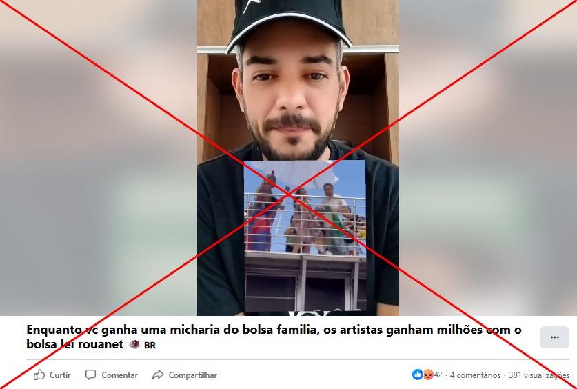 “Enquanto você ganha uma mixaria do bolsa família, eles ganham milhões com o Ministério da Cultura”, diz um homem em um trecho de um vídeo que circula no TikTok, no X, no Threads, no Facebook e no Instagram.