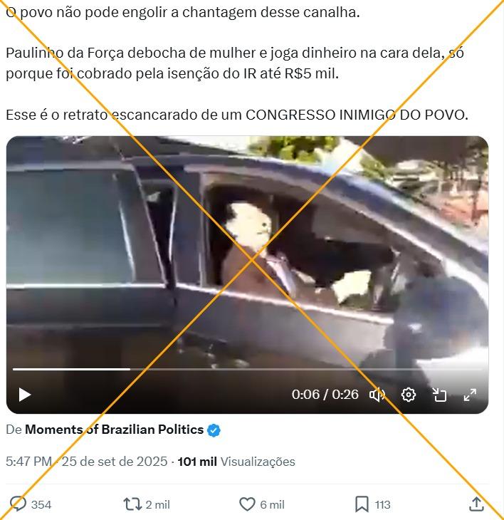 “Paulinho da Força debocha de mulher e joga dinheiro na cara dela, só porque foi cobrado pela isenção do IR até R$5 mil”, é a legenda de publicações no Facebook, no Instagram, no Threads, no TikTok e no X.