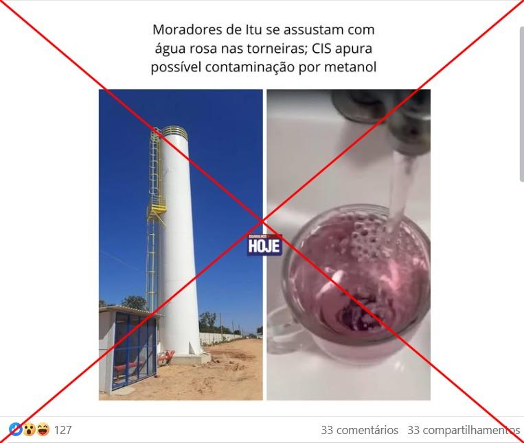 “Moradores de Itu se assustam com água rosa nas torneiras; CIS apura possível contaminação por metanol”, lê-se, junto a uma imagem compartilhada no Facebook. Alegações semelhantes circulam também no Instagram e no TikTok, e algumas delas apontam que a Polícia Civil estaria investigando o caso.