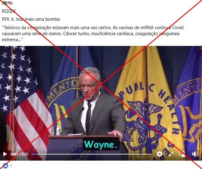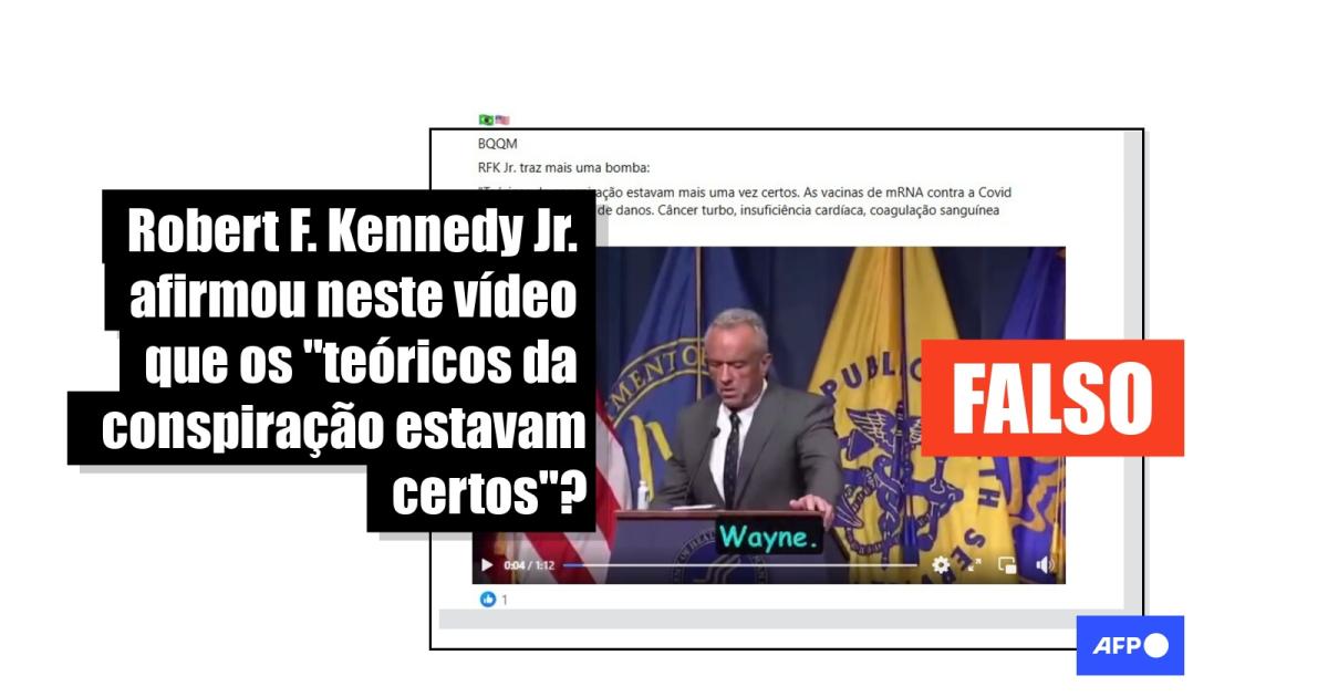 “RFK Jr. traz mais uma bomba: ‘Teóricos da conspiração estavam mais uma vez certos. As vacinas de mRNA contra a Covid causaram uma série de danos. Câncer turbo, insuficiência cardíaca, coagulação sanguínea extrema’”, diz a legenda de uma publicação no Facebook. Conteúdo semelhante circula no Instagram, no X e em espanhol.