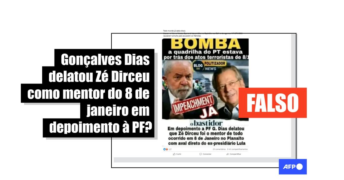 “Em depoimento a PF G.Dias delatou que Zé Dirceu foi o mentor de todo ocorrido em 8 de Janeiro no Planalto com aval direto do ex-presidiário Lula”, diz uma suposta manchete que é compartilhada no Instagram, no Facebook, no Threads e no Kwai.