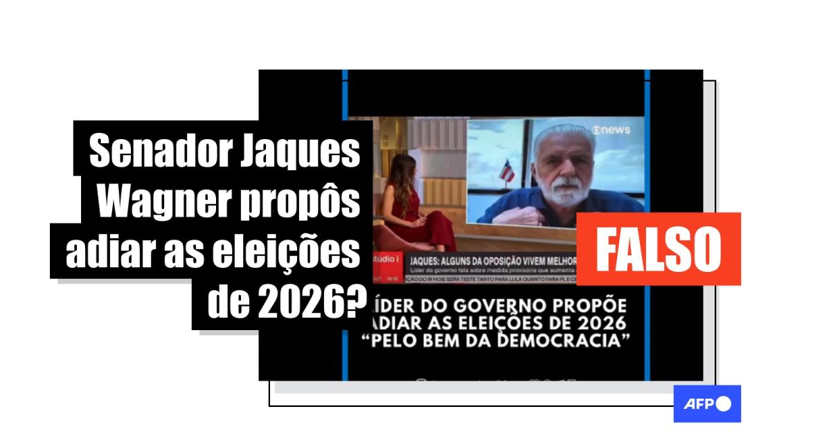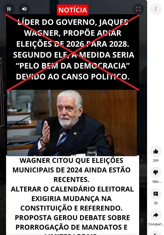 Uma Proposta de Emenda à Constituição (PEC) que prevê o fim da reeleição e mandatos de cinco anos no Executivo e no Legislativo está em tramitação no Senado. Desde o início de outubro de 2025, um vídeo em que o senador Jaques Wagner (PT) comenta sobre essa proposta em uma entrevista foi distorcido em publicações visualizadas mais de 400 mil vezes nas redes sociais. Segundo as postagens, ele teria defendido adiar as eleições de 2026. Isso é falso. No trecho, Wagner defende a aprovação da proposta analisada no Senado ao ser questionado sobre a sua opinião para as eleições de 2030.