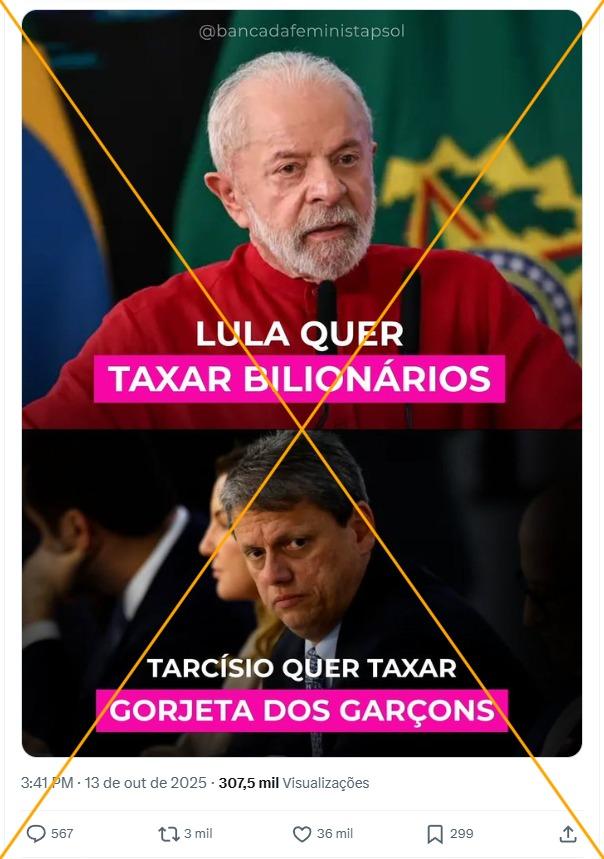 “Lula quer taxar bilionários. Tarcísio quer taxar gorjeta de garçons”, lê-se em uma imagem publicada no X. Conteúdos foram compartilhados também no Facebook e no Instagram e pelos deputados Emídio de Souza (PT) e Jilmar Tatto (PT).