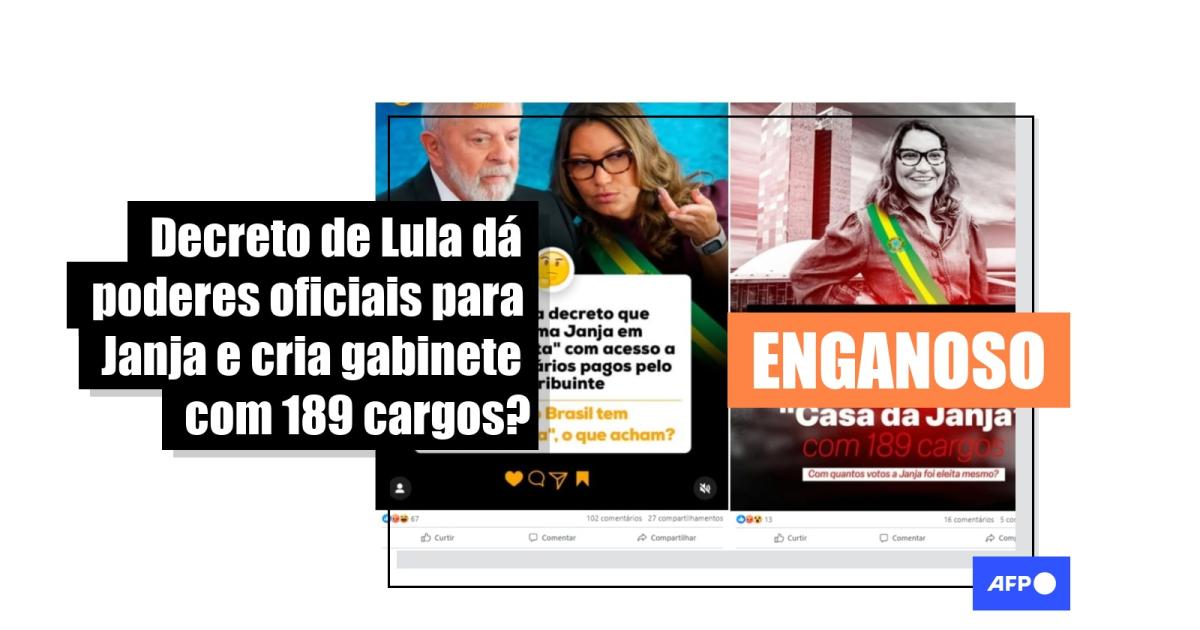 Em agosto de 2025, o presidente Luiz Inácio Lula da Silva (PT) assinou um decreto que prevê o apoio do gabinete pessoal da Presidência aos cônjuges dos chefes do Executivo. Desde que a medida foi noticiada em outubro, publicações nas redes sociais com mais de 700 mil interações alegam que ela transforma a primeira-dama, Rosângela da Silva, em “copresidenta” e que um gabinete com 189 cargos foi criado para atendê-la. Mas a norma coloca à disposição de Janja serviços de um gabinete já existente sem equiparar funções, como disse um especialista e a assessoria de comunicação da Presidência à AFP.