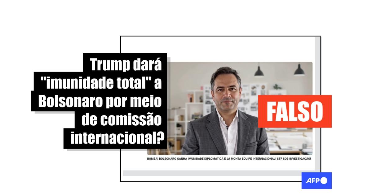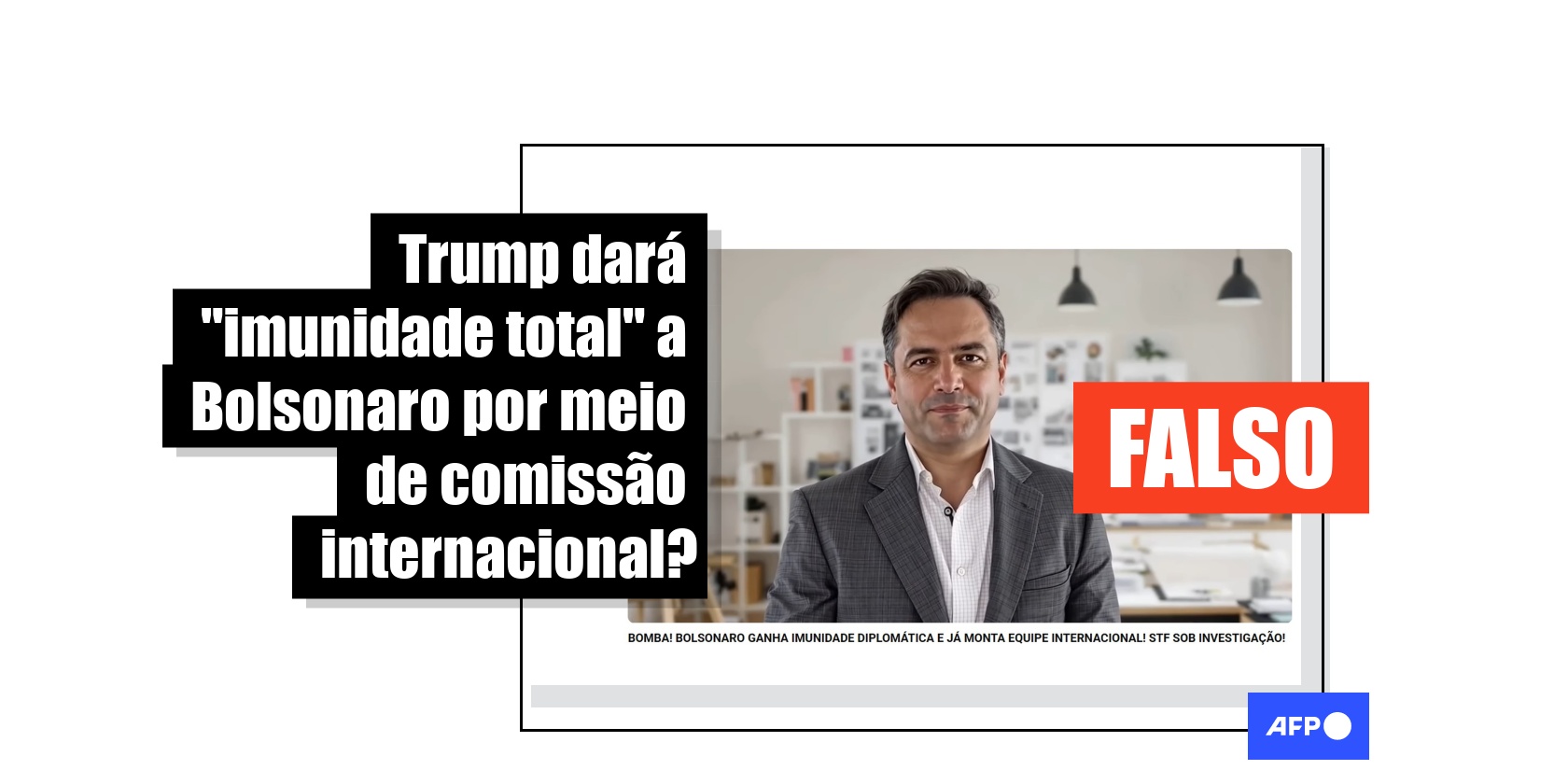 O ex-presidente Jair Bolsonaro (PL) foi condenado à prisão por tentativa de golpe de Estado em 11 de setembro de 2025. Cerca de um mês depois, vídeos com mais de 1 milhão de visualizações circulam com a alegação de que o mandatário dos Estados Unidos, Donald Trump, nomeará Bolsonaro para uma comissão internacional que lhe dará “imunidade total”. Mas as gravações foram criadas por um canal de “crônicas hipotéticas geradas com Inteligência Artificial”. O direito internacional tampouco permite que um chefe de Estado conceda imunidade diplomática a um estrangeiro por conta própria.