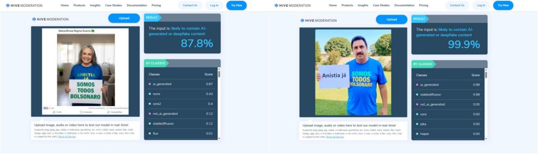 O AFP Checamos também submeteu as imagens à ferramenta de detecção de IA Hive Moderation. Em algumas delas, o resultado foi inconclusivo, mas na maioria foram identificadas altas porcentagens de manipulação.