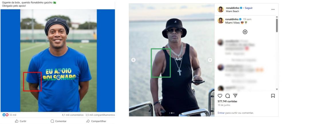 Além disso, algumas fotografias também contêm inconsistências características de conteúdos criados por inteligência artificial. Uma das imagens viralizadas do ex-jogador Ronaldinho Gaúcho, por exemplo, exibe uma suposta tatuagem tribal em seu braço direito. O atleta, no entanto, não possui nenhum desenho tatuado nos braços, como mostram publicações recentes em sua conta no Instagram.
