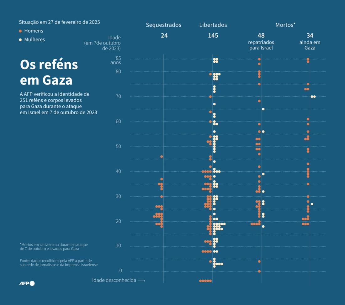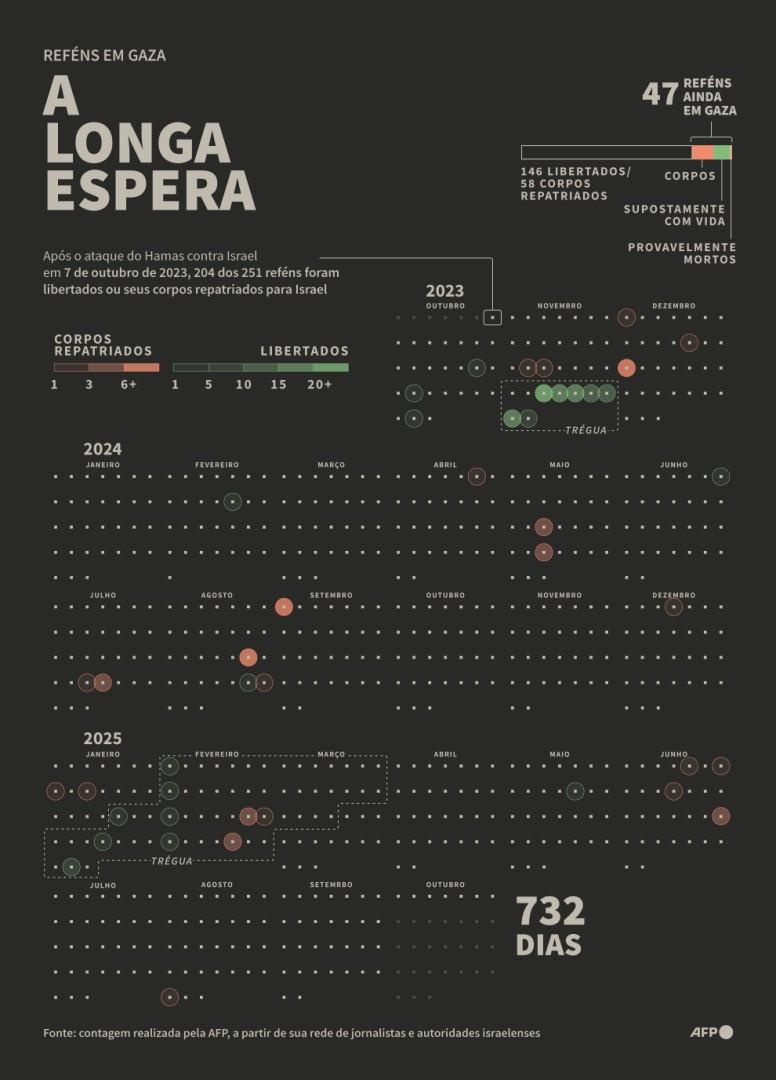 Em outubro de 2025, quando entrou em vigor o acordo de cessar-fogo, 48 reféns vivos ou mortos ainda permaneciam em Gaza.