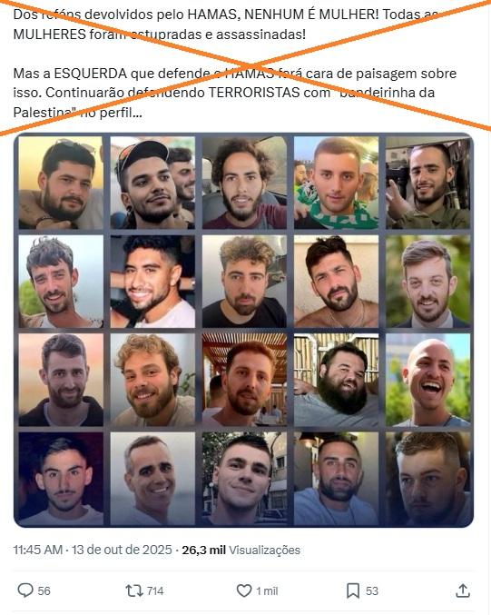 “Nenhum dos reféns devolvidos pelo Hamas é mulher, todas foram mortas pelos terroristas”, diz a legenda de uma imagem no Facebook. Mensagens similares circulam no Instagram, no X e no TikTok.