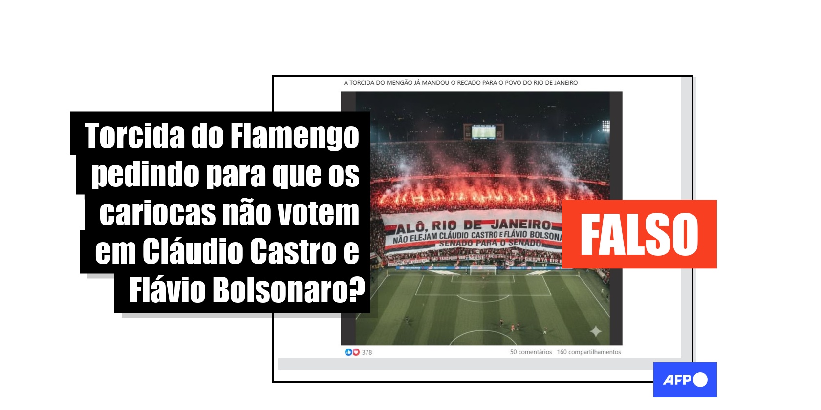 A pouco menos de um ano para as eleições de 2026, o pleito já começa a gerar desinformação nas redes sociais. Ao contrário do que indicam publicações com mais de 6,5 mil interações desde 23 de outubro de 2025, a torcida do Flamengo não exibiu um bandeirão pedindo para os cariocas não votarem no governador Cláudio Castro (PL) e no senador Flávio Bolsonaro (PL) ano que vem. A imagem que acompanha as postagens foi gerada por inteligência artificial (IA) e não há nenhum registro de uma manifestação desse teor.